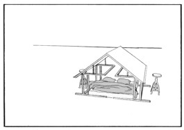 — Ce dessin représente un habitat symbolique composé de deux tables à dessin formant un toit au-dessous duquel se loge un lit. à la fois précaire et romantique, ce dessin traduit les difficultés du quotidien de la vie d'artiste. Inscrit sur 4 tables de travail appartenant à des plasticiens, le dessin s'ancre dans des éléments issus du réel. Les tâches et les annotations de travail présentes mettent en avant des histoires, des réflexions de travail, des temps de partage et d'attente.